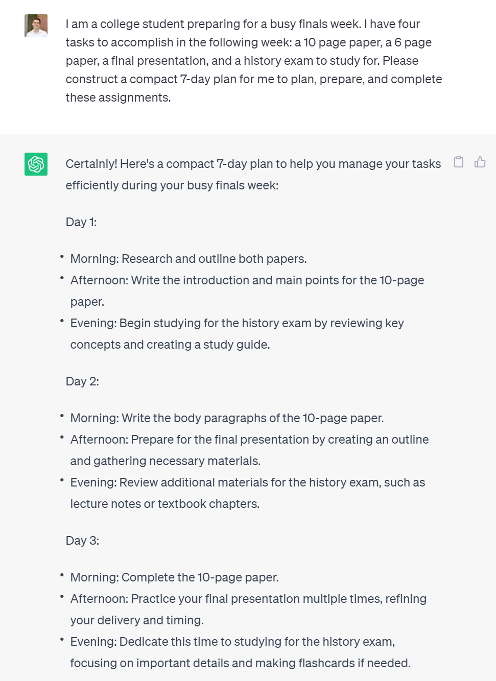Time Management and Mental Health: Poor time management and “cramming” can increase stress and have negative impacts on mental health. GenAI can expedite work processes and assist in creating schedules that help students navigate heavy workloads. Consider a portion of ChatGPT response to a student’s prompt about preparing for finals week:
