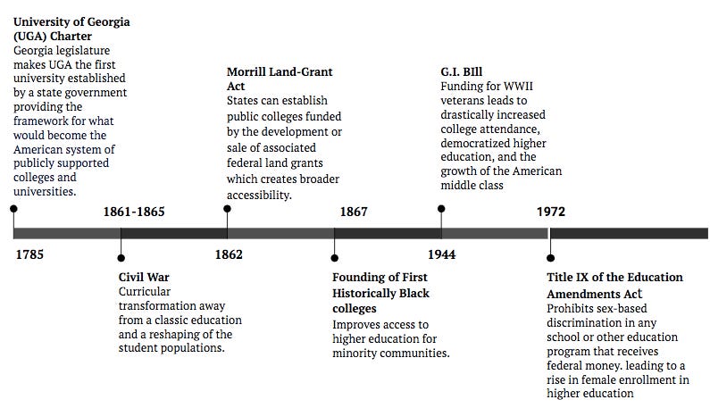 Other crucial inflection points include the establishment and growth of the elective system at Harvard in 1873-1874, the 1965 Higher Education Act, the emergence of online education, and the COVID-19 pandemic. Colleges and universities have also navigated social movements (e.g., Civil Rights and Counterculture) and economic shocks (e.g., The Great Depression and The Great Recession). Through it all, America's higher education system has been resilient, adapting to these one-off episodes and social, cultural, and economic shifts.