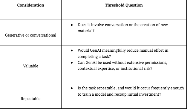 So, specific to higher education, what can GenAI do? Let’s start by segmenting use cases into administrative/operational and academic buckets. We rely on a framework proposed by Mark Maby from Info-Tech Research Group to determine whether GenAI can significantly enhance a use case.