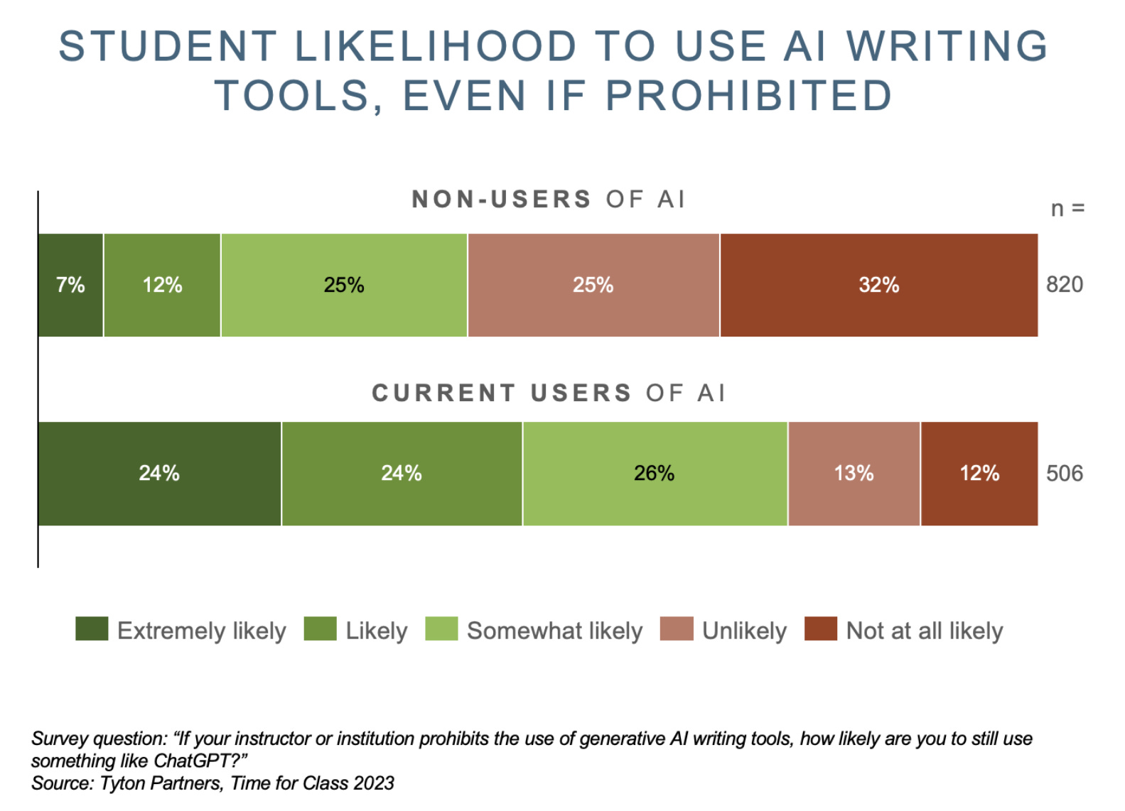 Adoption: College students have rapidly adopted GenAI into their academic toolkit. A survey conducted last spring found that one in three students was using GenAI. The actual percentage is likely higher and rising, given GenAI’s capability to enhance productivity for students yearning for an academic edge in their highly-competitive, time-constrained environment. In most cases, students are exploring GenAI without direction or training, as institutions have yet to formalize these types of supports. This institutional gap has not deterred students eager to capitalize on GenAI’s potential. College students have discovered such utility in GenAI that 51% of all college students and 69% of current student GenAI users vow to continue their usage even if banned by their administrators.